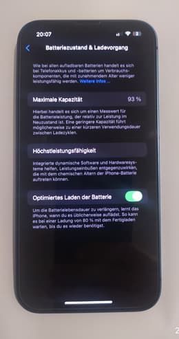 Ich habe ein iPhone 13 (256 GB) im Zustand Hervorragend bestellt, die Lieferung war sehr schnell und gut verpackt. Das Gerät macht insgesamt einen hervorragenden Eindruck – fast wie neu. • Display: keine Kratzer, True Tone funktioniert, Farben sind sehr kräftig. Auf den Fotos ist bereits eine Schutzfolie zu sehen – davor war das Display völlig kratzerfrei. • Face ID: funktioniert einwandfrei, auch im Dunkeln. • Lautsprecher: Stereo, klarer Klang ohne Rauschen. • Batterie: Kapazität bei 93 %, absolut in Ordnung für ein refurbished Gerät. • Leistung: Alles läuft flüssig, selbst Spiele wie PUBG funktionieren problemlos. Eine kleine Bemerkung: Links unten steht das Display minimal über dem Rahmen und wenn man in der Mitte fester drückt, hört man ein leises Klicken. Im Alltag stört das nicht, mit Hülle ist es ohnehin unsichtbar.